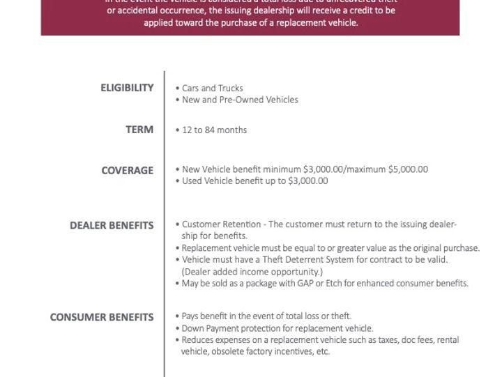 Dealer-issued credits toward replacement vehicles, plus consumer benefits like theft deterrents, window etching, and key protection. Helps retain customers and supports upsell with gap/etch combos.